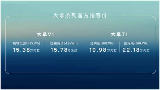 全新品牌已来,全新平台也应运而生。上汽大通MAXUS“全球纯电智慧轻型车架构平台”MILA,将成为品牌开启高品质新能源轻型车市场的问路之“玉”。面向全球市场和未来趋势,上汽大通MAXUS基于该平台打造的首款车型大拿V1、大拿T1同步震撼上市,以划时代的“全维度创新”产品力刷新全球新能源轻型车“天花板”。大拿V1售价15.38万元起;大拿T1售价19.98万元起。双车齐发,上汽大通MAXUS“大拿”助力用户成为“面子大拿”和“赚钱大拿”、“省心大拿”和“财富大拿”。