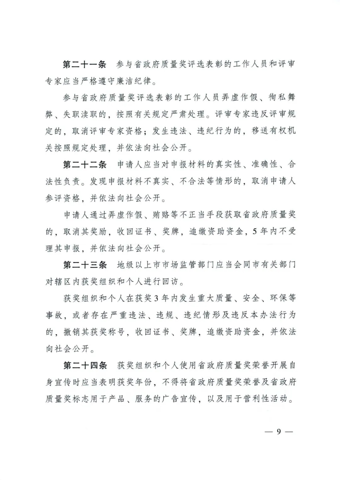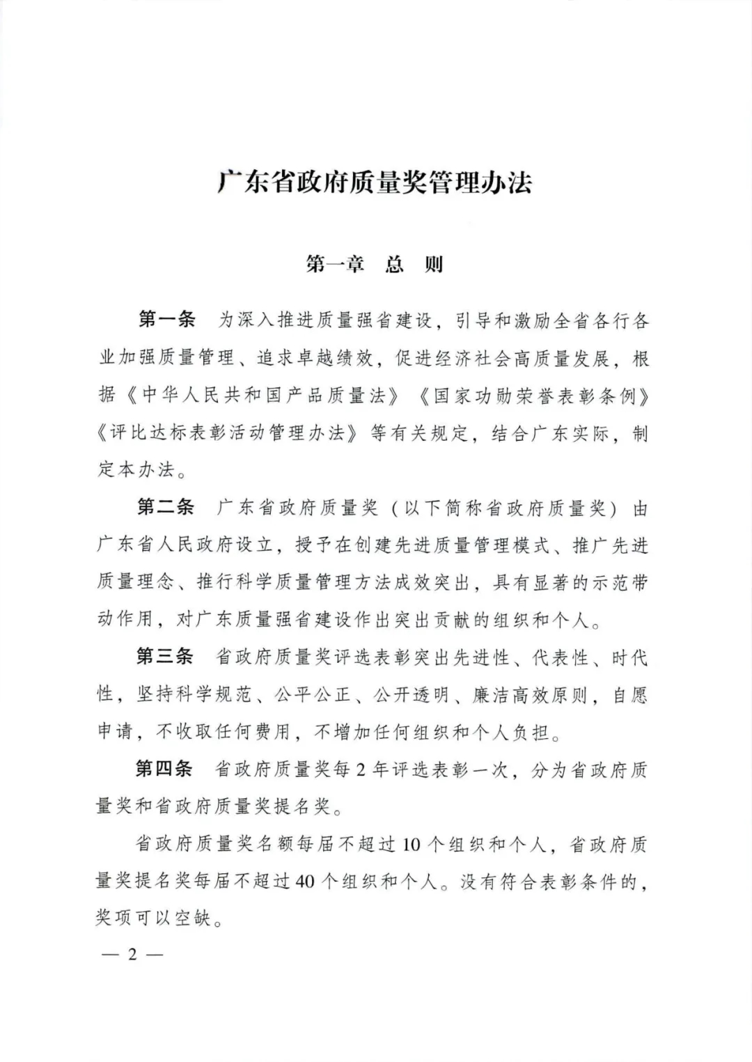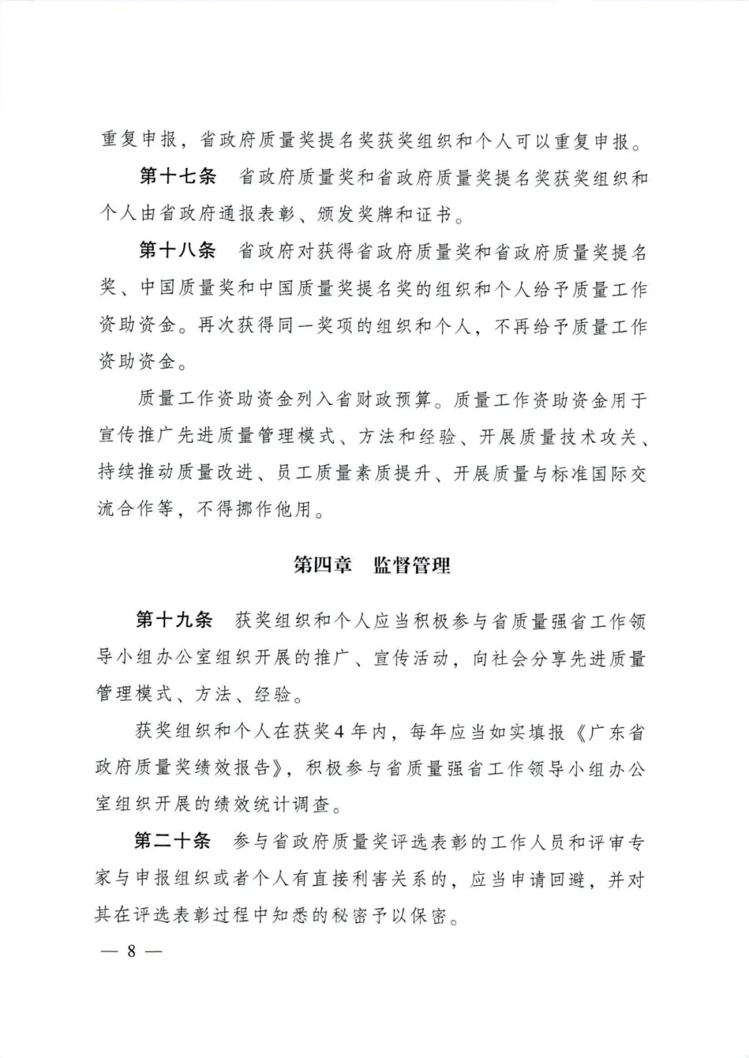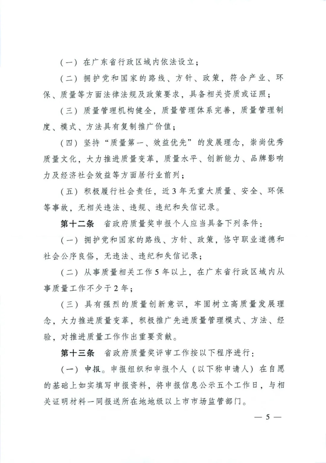 近日,广东省人民政府办公厅印发了新修订的《广东省政府质量奖管理办法》(粤府办【2021】55号)。修订后的《广东省政府质量奖管理办法》(下简称新办法)有以下几个突出特点:一是申报范围和名额扩大了,覆盖到社会经济各相关领域,获奖名额增加到50个,包括广东省政府质量奖不超过10个组织和个人,省政府质量奖提名奖每届不超过40个组织和个人。二是明确省政府质量奖评审依据由秘书处组织制定,经评选表彰委员会审定后向社会公开。三是评选流程有所变化,增加了申报、推荐、资格审查和公示报批等环节不少于5个工作日的公示要求,以及陈述答辩环节。四是对获奖组织和个人提出了新的要求,即获奖组织和个人在获奖4年内,每年应当如实填报《广东省政府质量奖绩效报告》,积极参与省质量强省工作领导小组办公室组织开展的绩效统计调查。