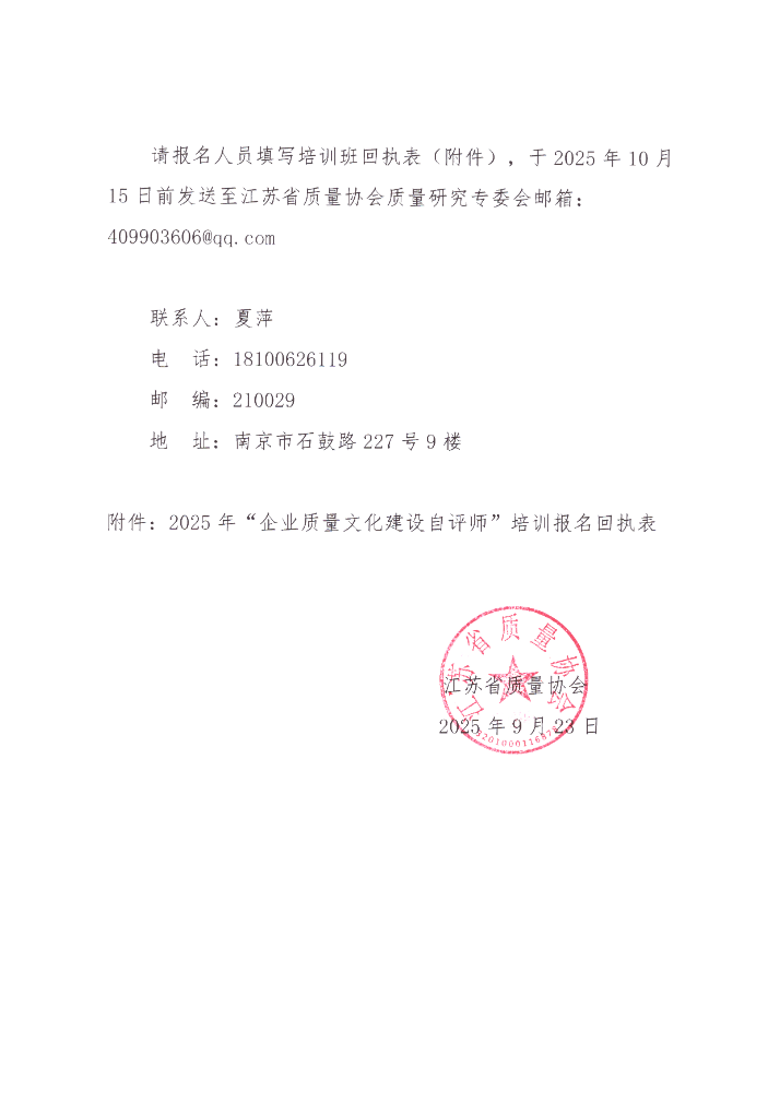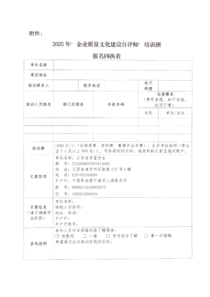 附件:2025年“企业质量文化建设自评师”培训班报名回执表