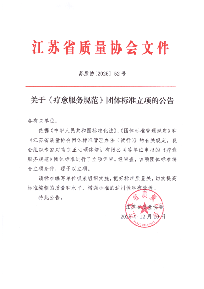 关于《疗愈服务规范》团体标准立项的公告
