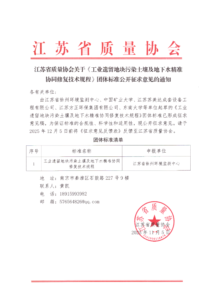 江苏省质量协会关于《工业遗留地块污染土壤及地下水精准协同修复技术规程》团体标准公开征求意见的通知