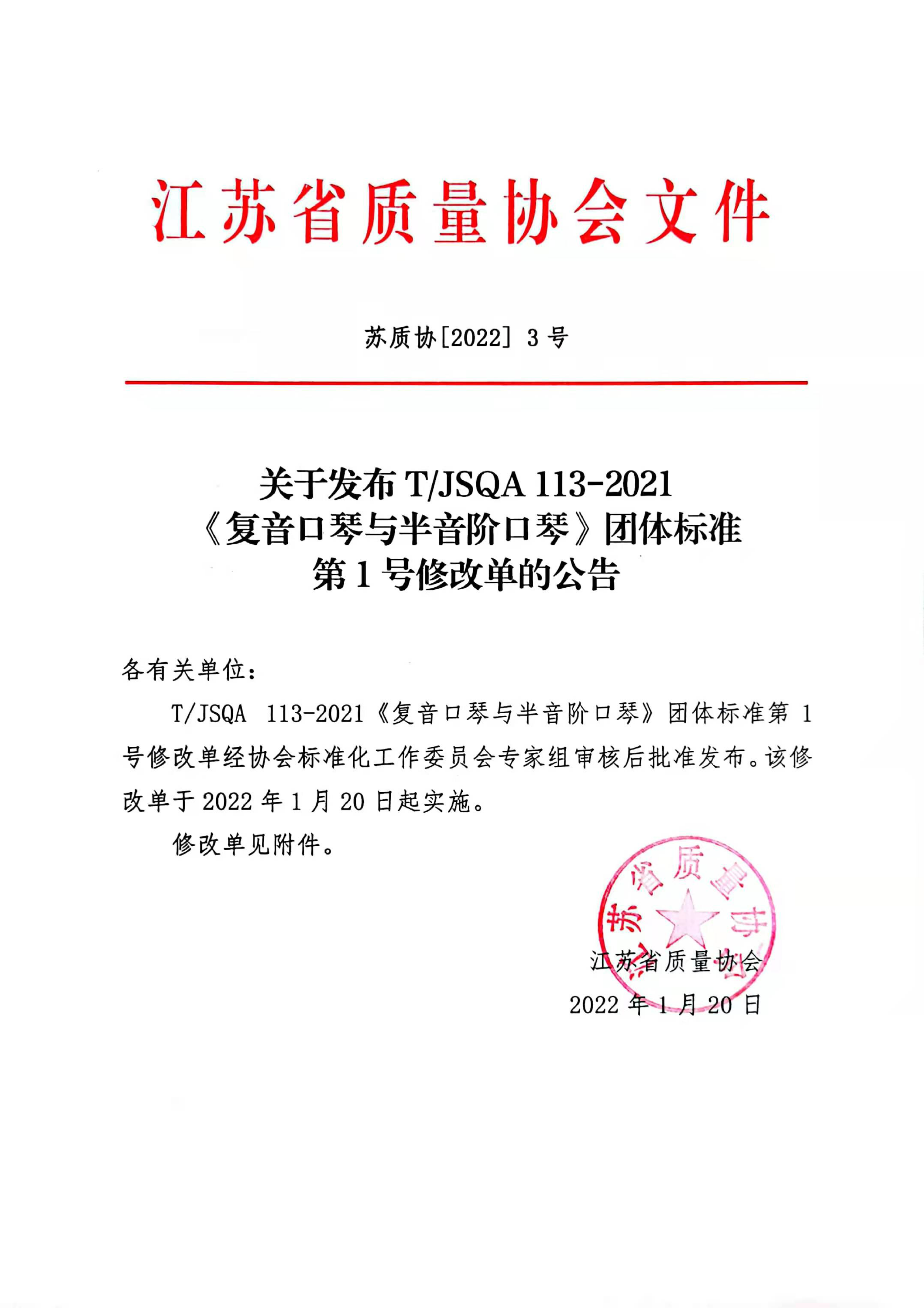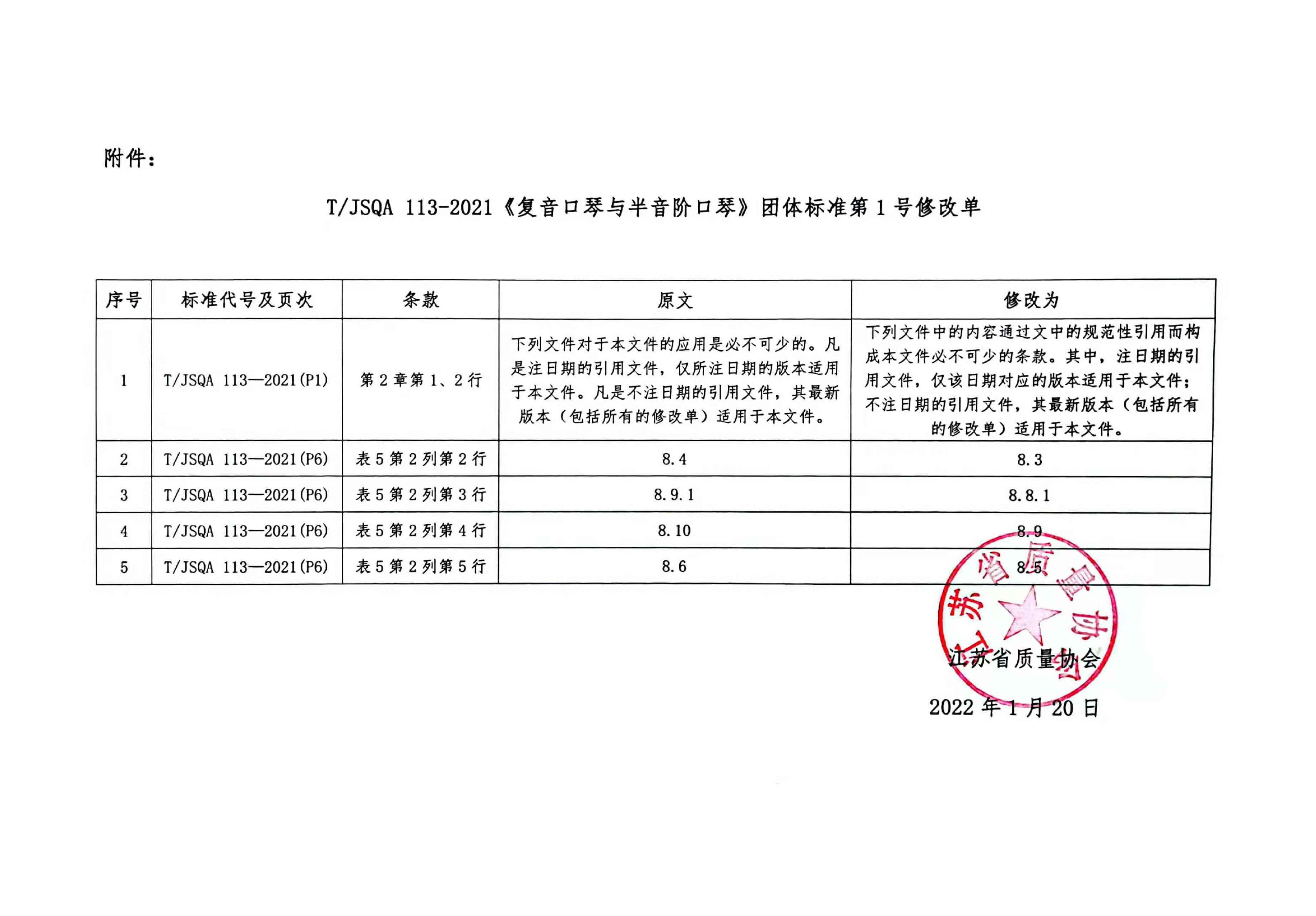 关于发布T/JSQA 113-2021《复音口琴与半音阶口琴》团体标准第1号修改单的公告