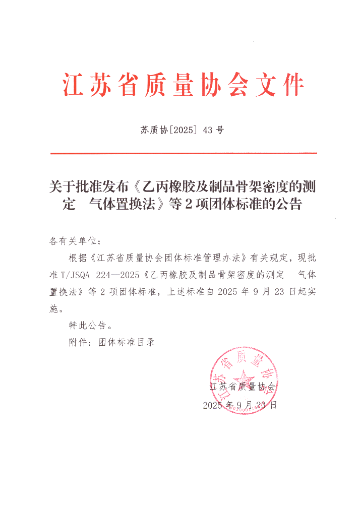 关于批准发布《乙丙橡胶及制品骨架密度的的测定 气体置换法》等2项团体标准的公告