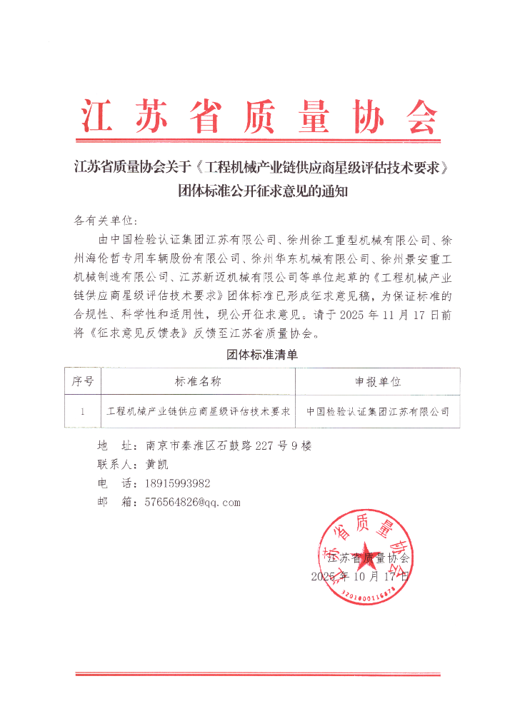 江苏省质量协会关于《工程机械产业链供应商星级评估技术要求》团体标准公开征求意见的通知