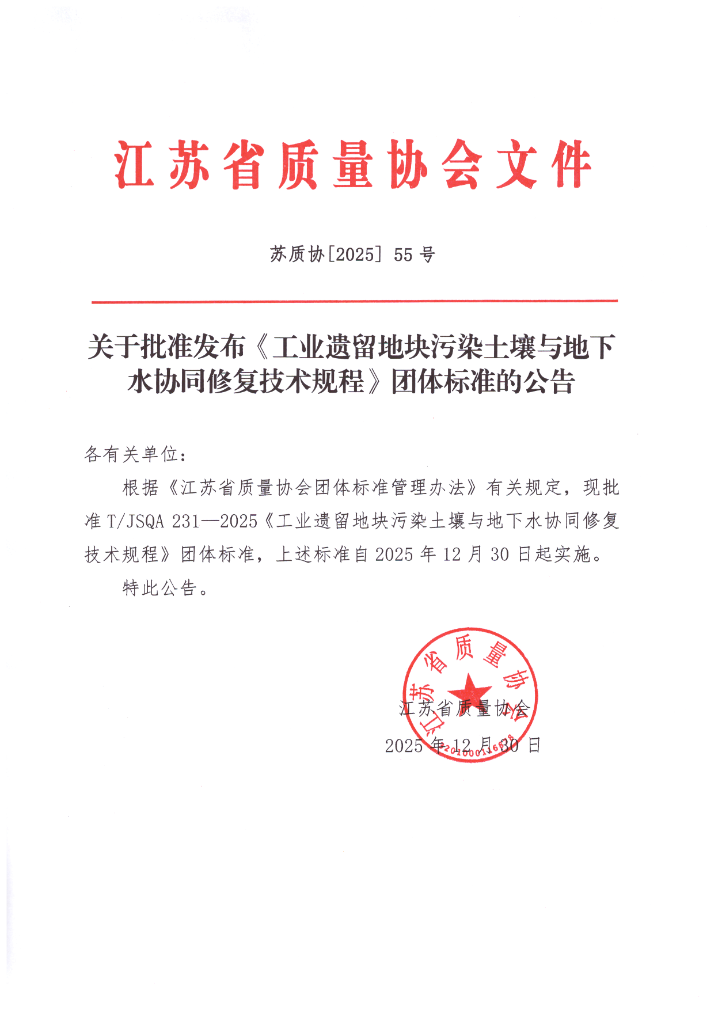 关于批准发布《工业遗留地块污染土壤与地下水协同修复技术规程》团体标准的公告