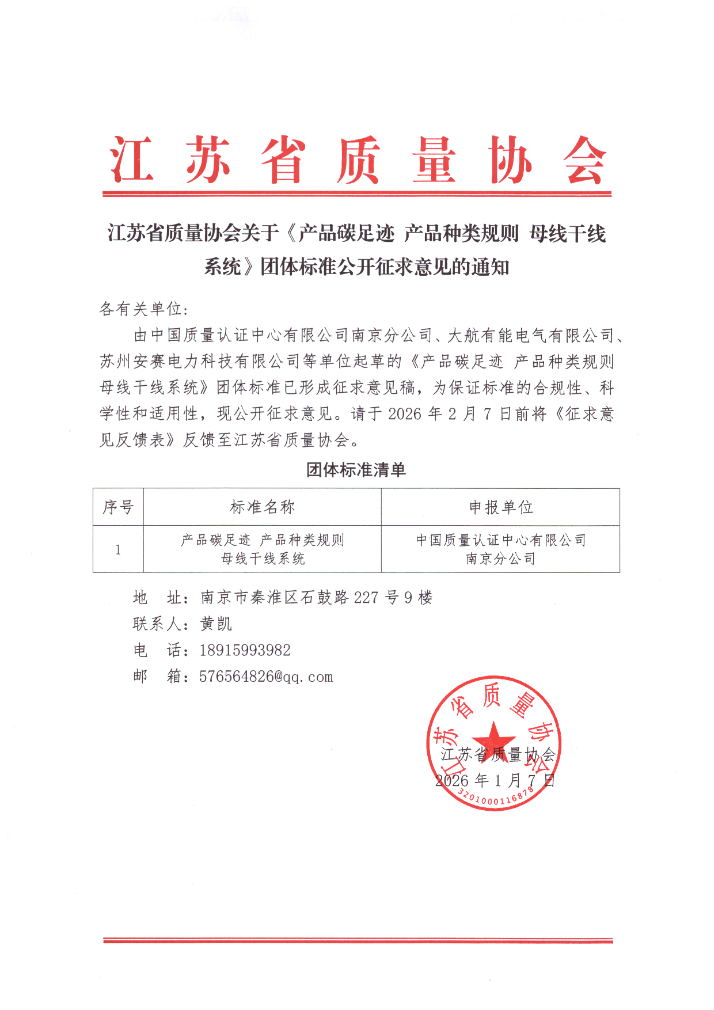 江苏省质量协会关于《产品碳足迹 产品种类规则 母线干线系统》团体标准公开征求意见的通知