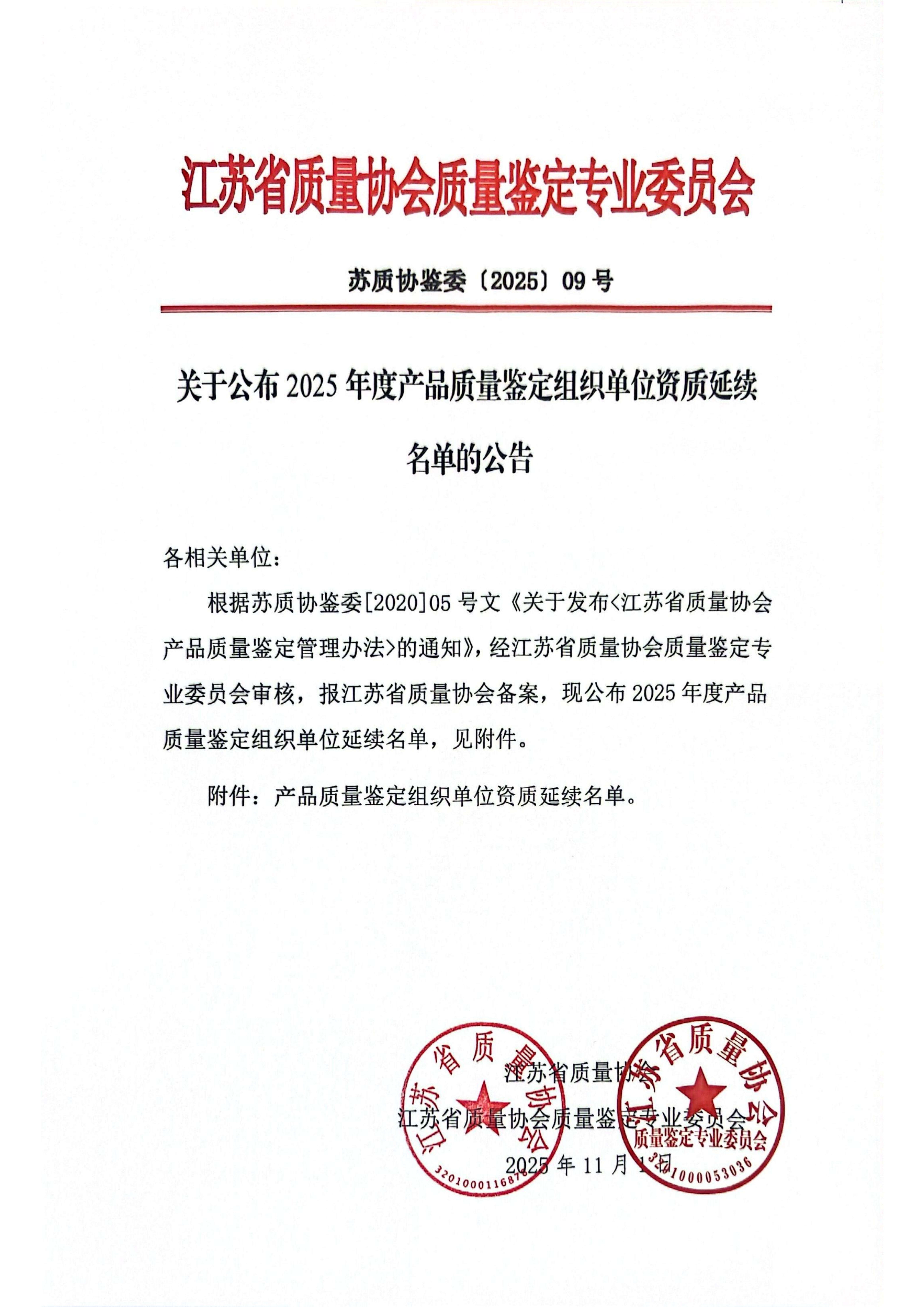 关于公布2025年度产品质量鉴定组织单位资质延续名单的公告
