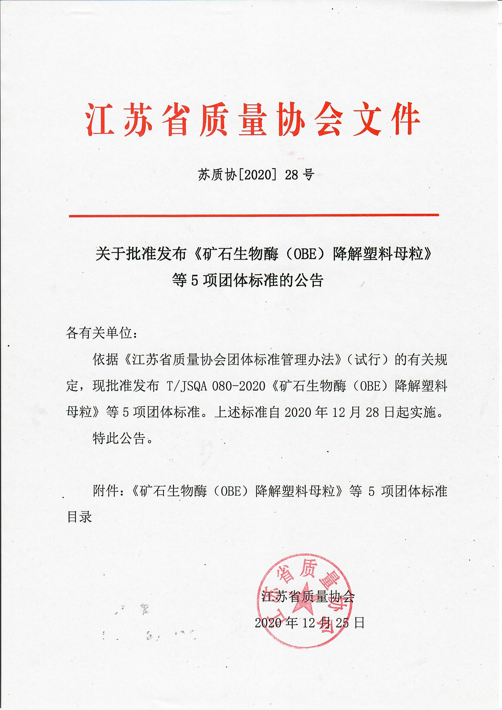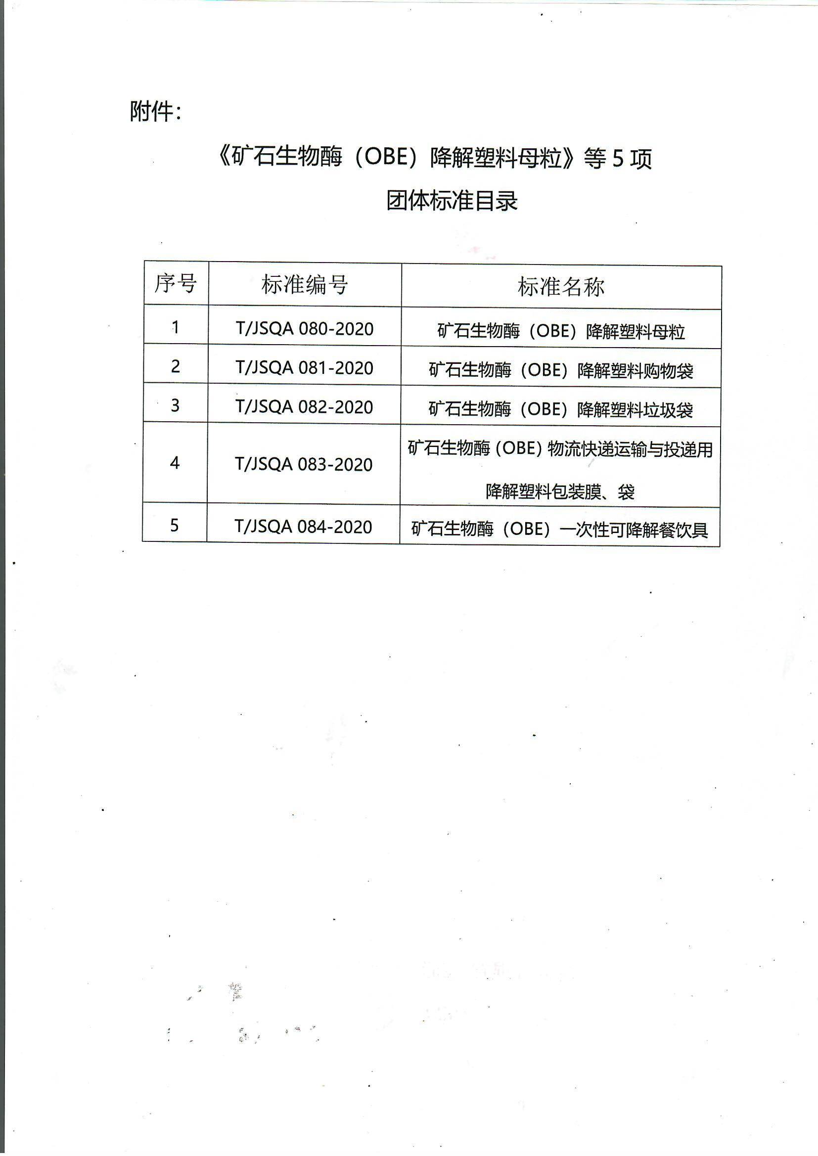 关于批准发布《矿石生物酶(OBE)降解塑料母粒》 等5项团体标准的公告
