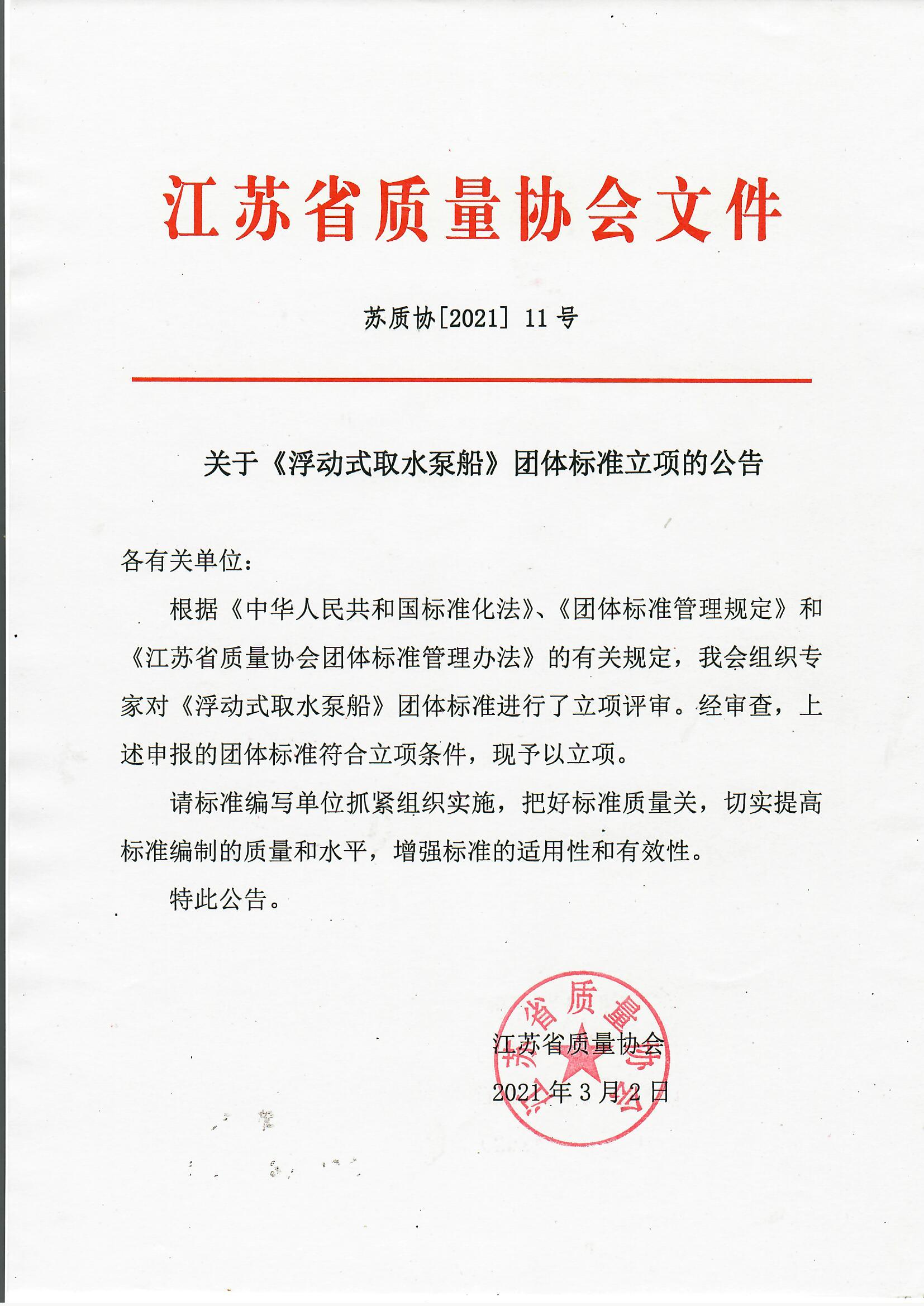 关于《浮动式取水泵船》团体标准立项的公告