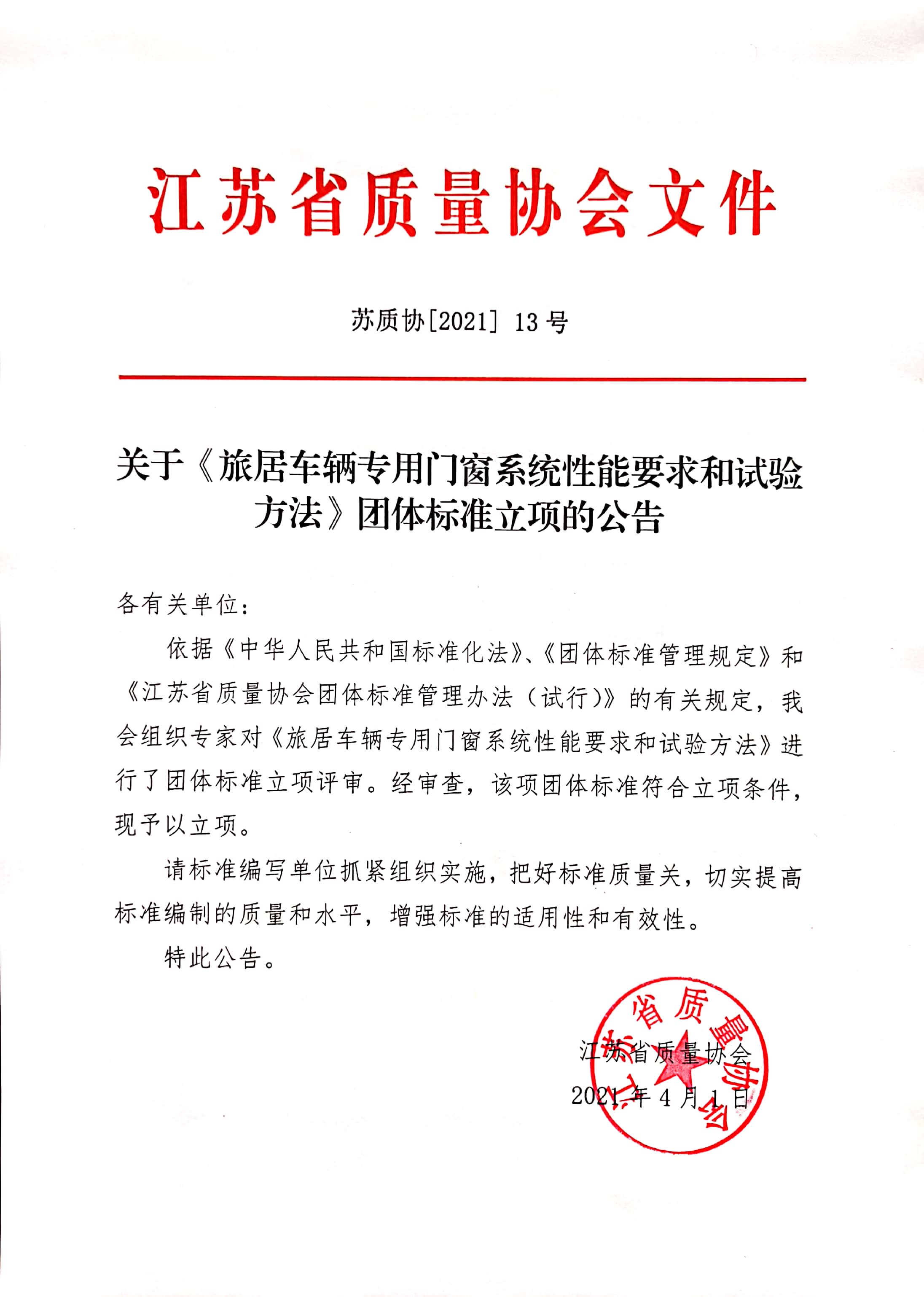 关于《旅居车辆专用门窗系统性能要求和试验方法》 团体标准立项的公告